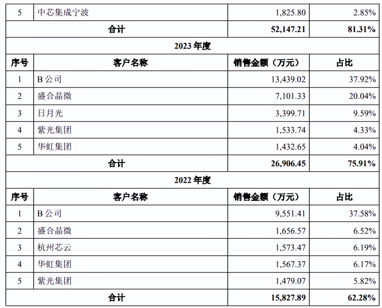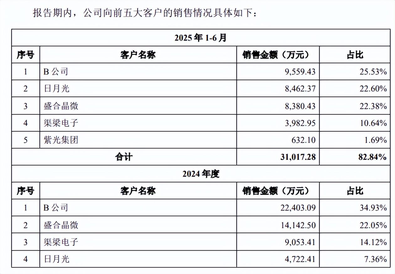 主要客户方面,强一半导体客户集中度较高,前五大客户销售金额占营业收入的比例分别为 62.28%、75.91%、 81.31%和 82.84%,前5大客户包括B公司、日月光、盛合晶微、紫光集团、渠梁电子、华虹集团等。