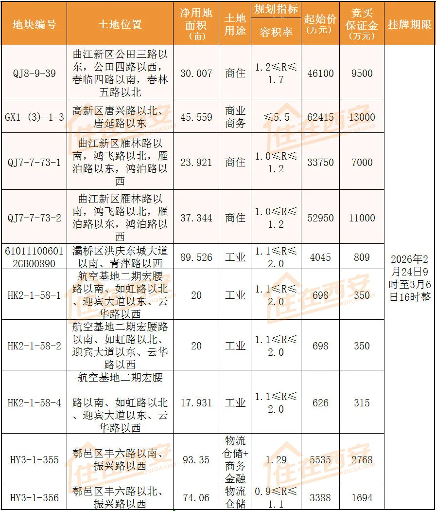 2026年1月27日,西安10宗共计451.698亩地出让,宗地网上挂牌期限为:2026年2月24日9时至3月6日16时整。