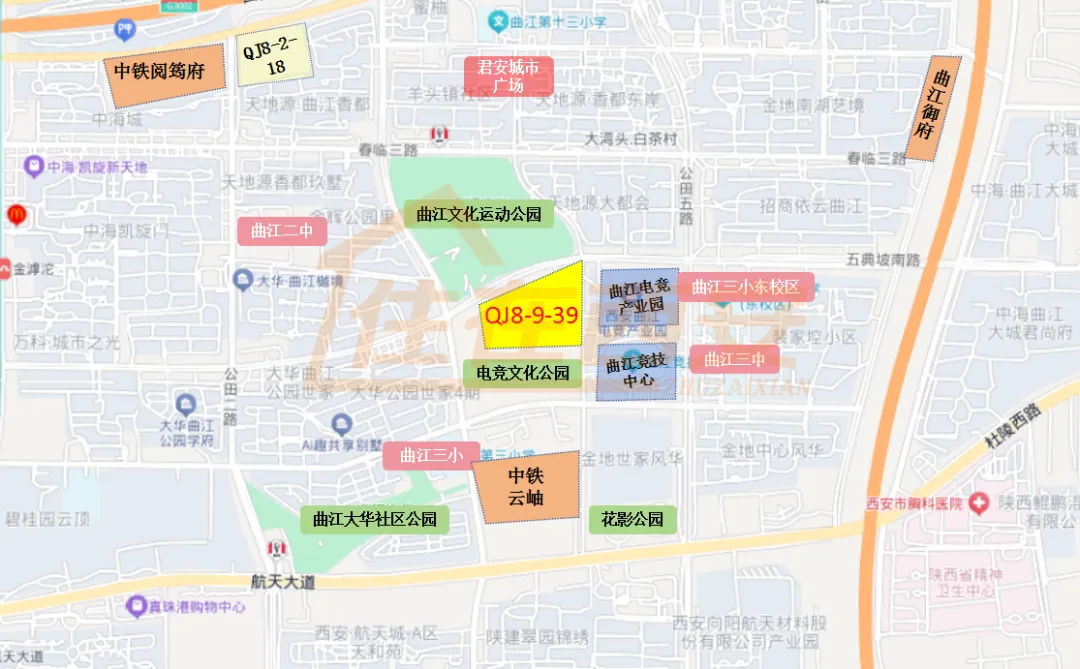 地块南侧一路之隔是九年制的铁一中曲江第一学校,周边还有曲江第十一小学、曲江第六小学等教育配套。周边有西安中大国际医院,西北妇女儿童医院等医疗康养配套,以及正荣彩虹谷、曲江创意谷等商业配套。