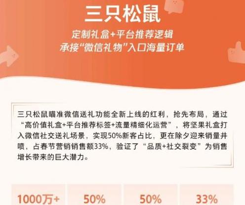 在春节期间通过微信送礼购买家庭用品,如三只松鼠的年货套装、王老吉等也是一个趋势。
