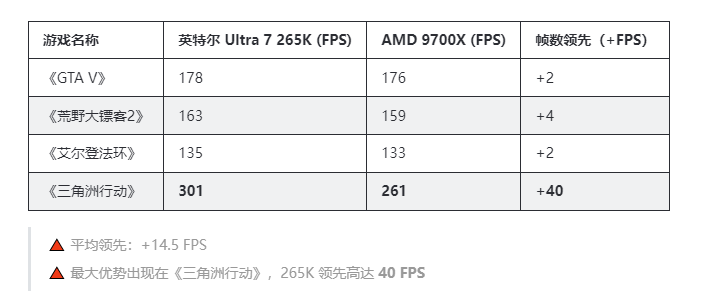 玩《GTA V》《荒野大镖客2》《艾尔登法环》《三角洲行动》这四款游戏里,英特尔 Ultra 7 265K 的帧率表现都比 AMD 7 9700X 要好。平均下来,英特尔 Ultra 7 265K 领先 +14.5 FPS,其中最大优势出现在《三角洲行动》,265K 领先高达 40 FPS。这就意味着,用英特尔 Ultra 7 265K 玩游戏,咱们能体验到更流畅的画面。