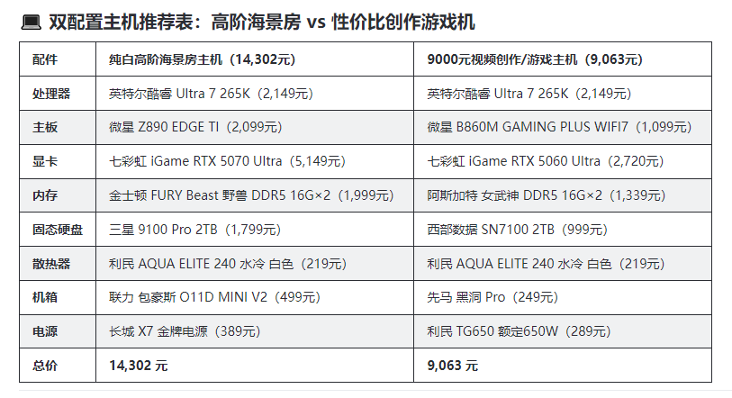• 性价比党(9千):265K+RTX 5060 Ultra,游戏能拉满画质,剪视频也不卡,预算不多也能爽。
