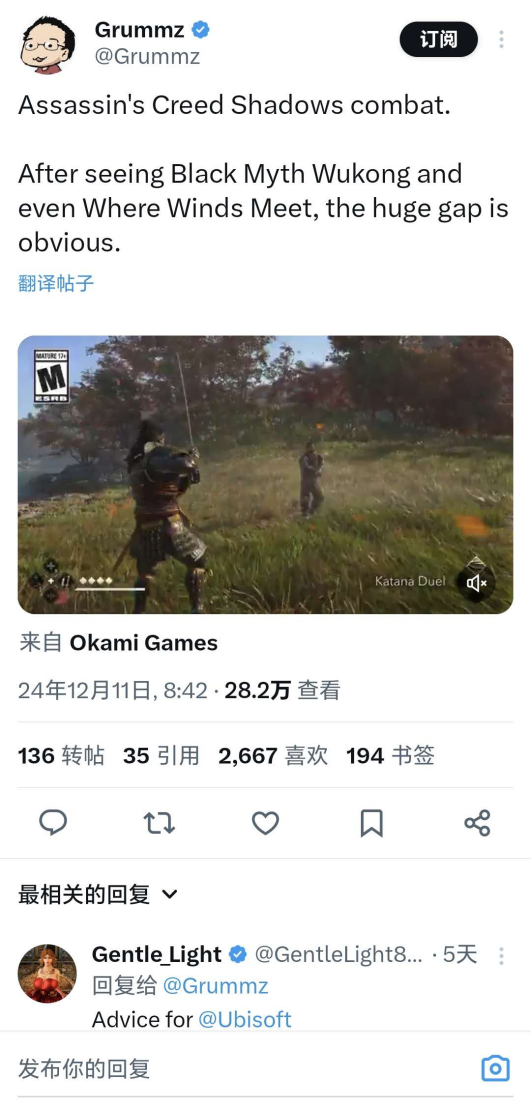 他直言不讳地将《燕云十六声》与经典系列《刺客信条》的新作《刺客信条·影》相提并论,并认为《燕云十六声》在某些方面远胜于后者。