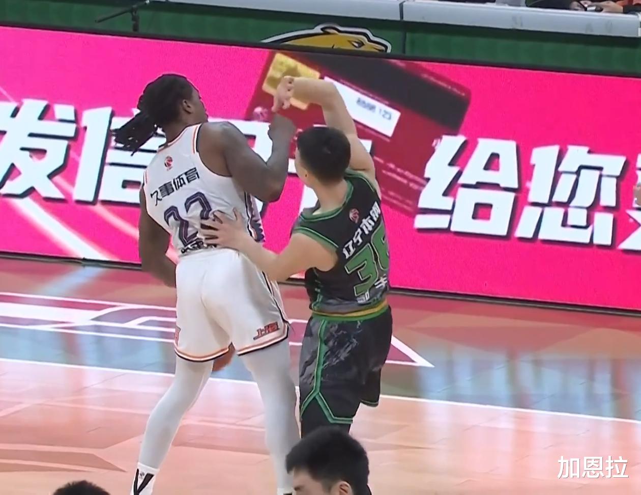 包括在威尔斯上篮不中之后,李晓旭上去抢前场篮板和威尔逊争抢到一块,把他给推出了界外,然后裁判竟然吹了上海队出界。这球李晓旭不是推人犯规了吗?一把推出去也能叫抢球吗?这球不犯规,这裁判是真有点太夸张了吧。