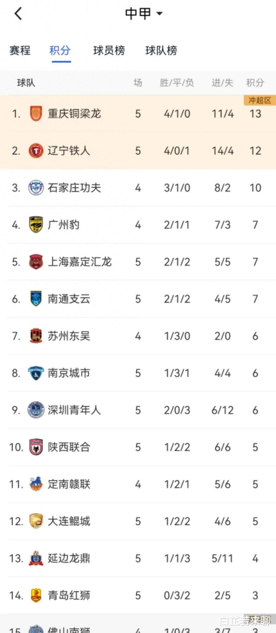 中甲联赛第五轮烽烟再起,石家庄功夫、重庆铜梁龙、辽宁铁人三强鼎立之势初现。本轮比赛,重庆铜梁龙和辽宁铁人分别迎战南通支云和深圳青年人,最终,辽宁铁人7-1逆转战胜深圳青年人,重庆铜梁龙4-2力克南通支云,两队继续领跑积分榜。