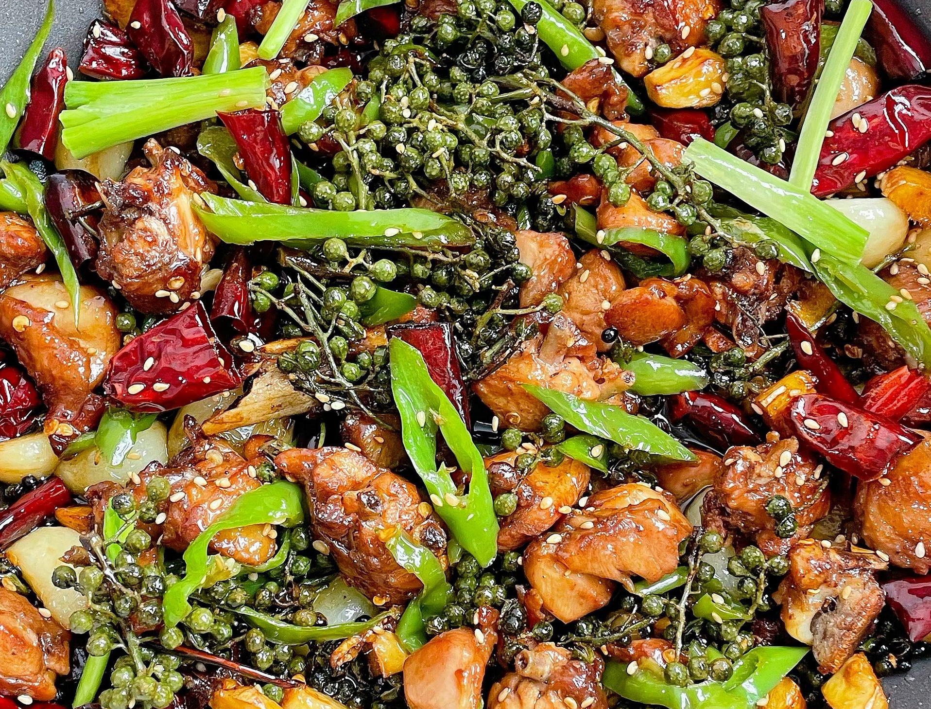 青花椒鸡:麻香鲜嫩青花椒鸡是一道绝对不会让人失望的家常菜,用鸡翅和鸡腿肉,搭配青花椒、青椒,保证麻香鲜嫩。