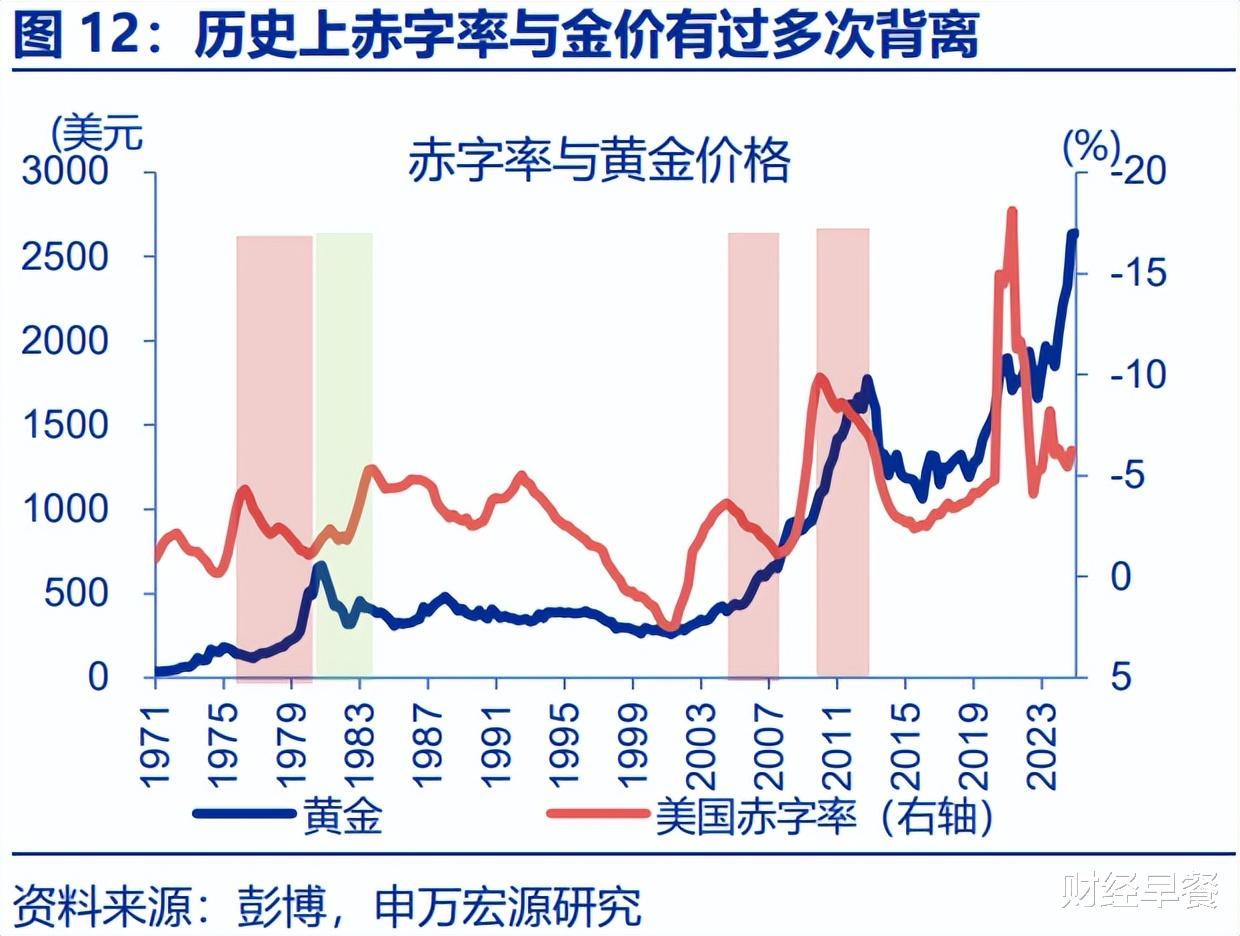 据申万宏源研报,历史回溯来看,赤字率与金价有过多次背离:如1976-1979年、2004-2007年、2008-2012年,赤字率回落但金价大涨;1980-1983年赤字率上升但金价大跌。总体而言,当美国经济较强时,紧缩性货币带来了金价的下跌,紧缩性财政政策带来了赤字率的回落;而经济危机中,避险与宽货币支撑了金价的大涨,积极的财政政策则意味着赤字率的走高。