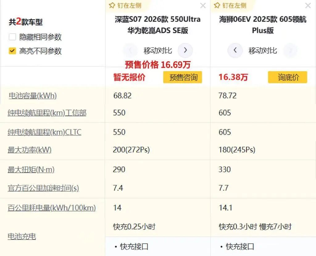 为了直观呈现两款车的产品差异,我们选取了预售价为16.69万元的深蓝S07 2026款 550Ultra 华为乾崑ADS SE版(下文简称:全新深蓝S07 EV),以及指导价为16.38万元的比亚迪海狮06新能源 2025款 EV 605领航Plus版(下文简称:海狮06 EV)来做对比。如果你正计划买一款这一级别的中型纯电SUV,今天的内容一定要看完。