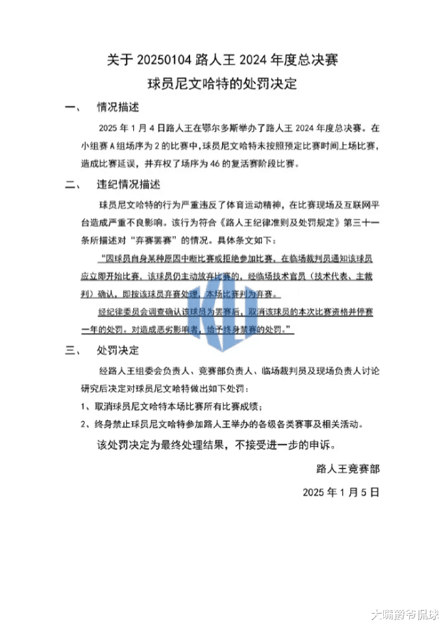 日前,国内“路人王”赛事官方宣布,球员尼文-哈特因为罢赛问题,已经被该赛事终生禁赛。