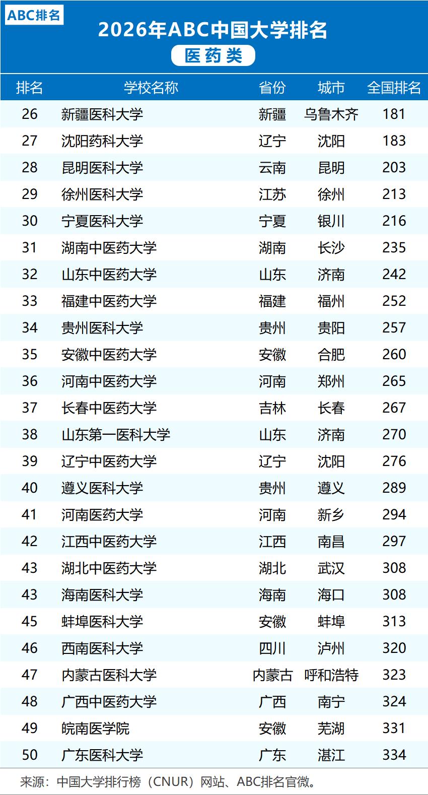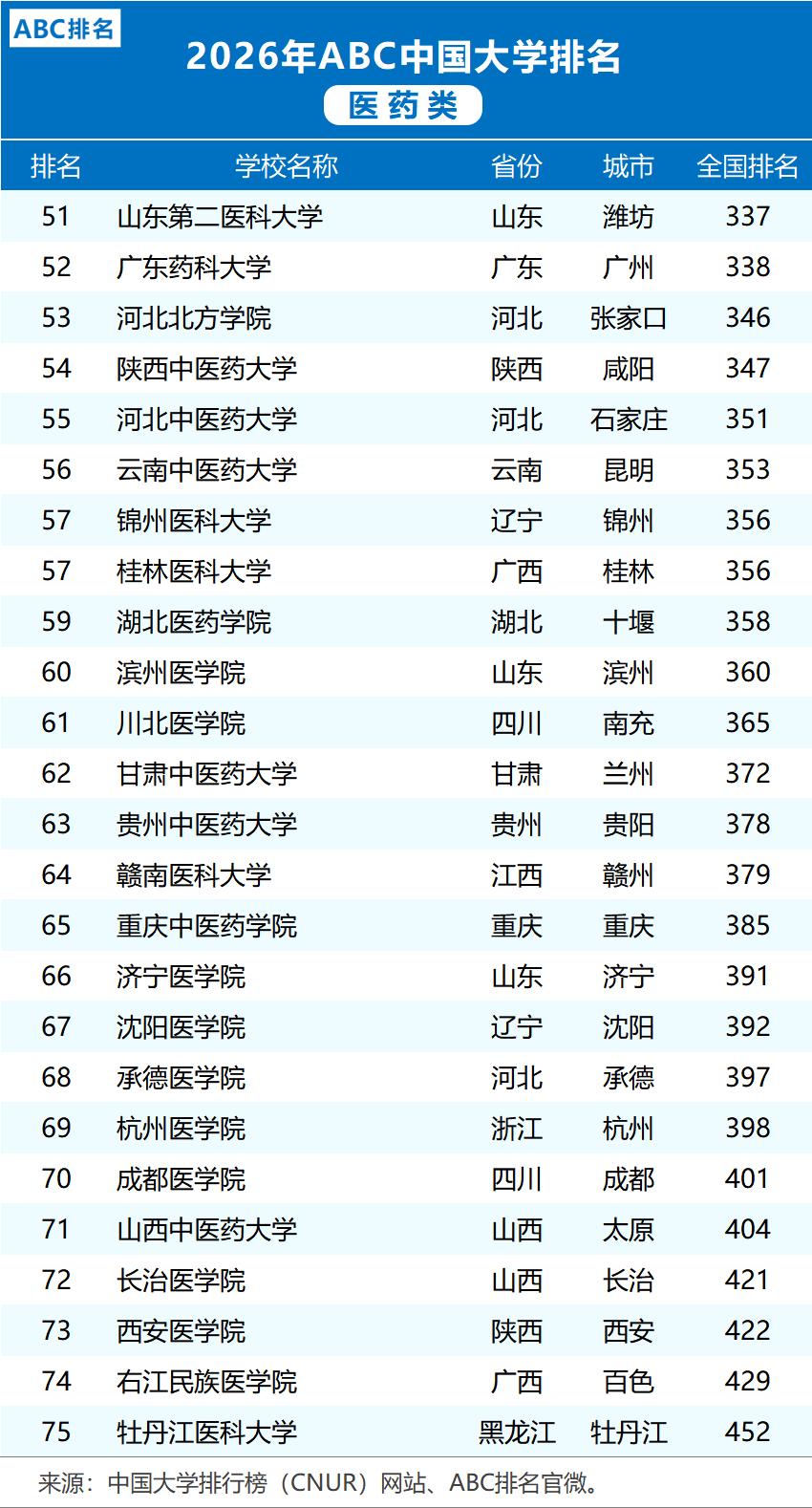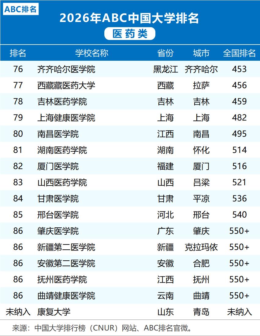 九十所医药学府同场比拼,一份刚发布的二零二六年ABC排名值得关注,CNUR网站在一月公布了名单,今年的医药类高校入围者比往年多了三个,榜单有不少看点,比如有些学校努力多年终于挤身百强行列,一些中医药院校名次悄然上升十几位,还有几家传统强校的位置没有丝毫动摇。