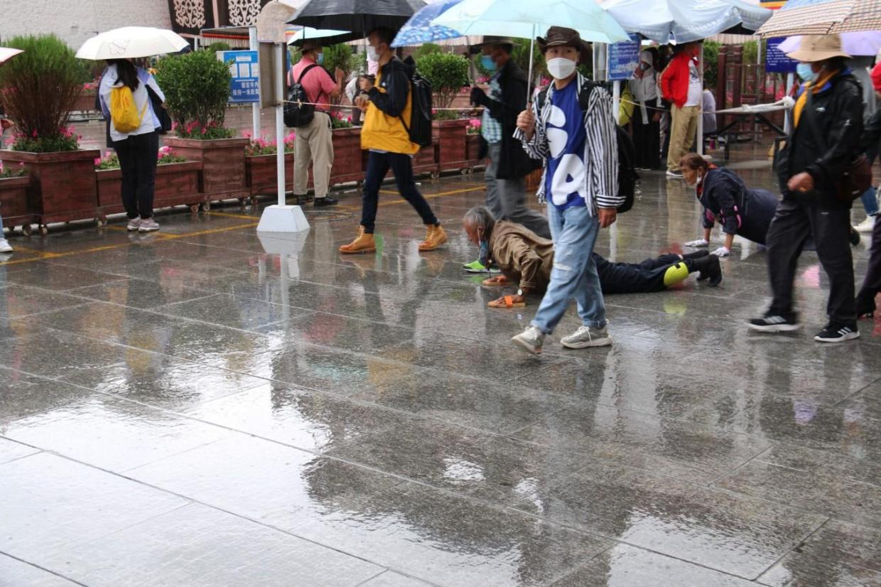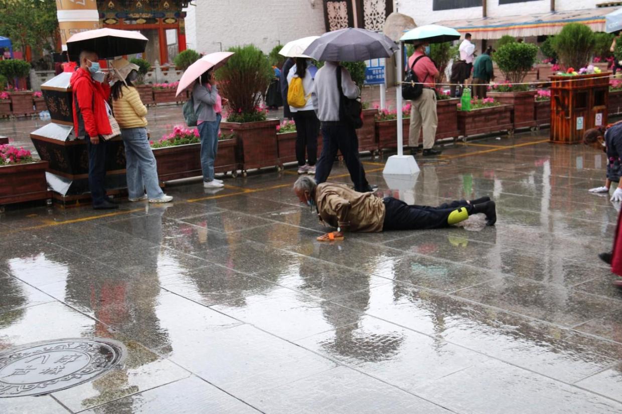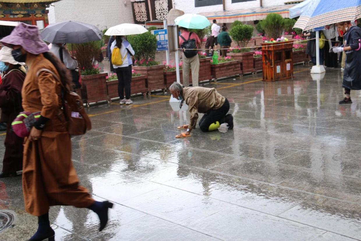 雨水中,虔诚信徒三步一头,顺时钟沿着大昭寺磕着五体投地的长头,身边的游客与民众都不在他们的眼中,走三步,跪下,全身匍匐在地,不知道此刻他们的内心世界是什么样的世界,也许尊重理解是此刻彼此的最大公约数。