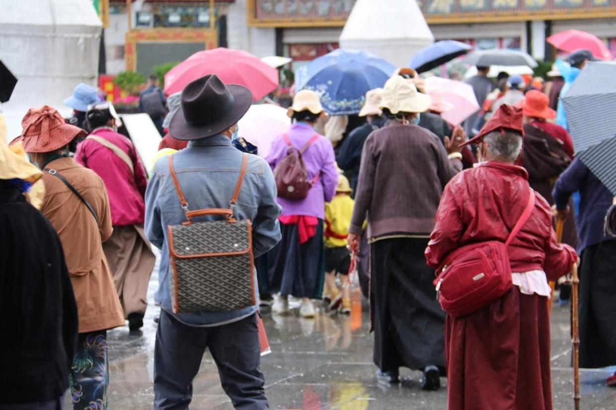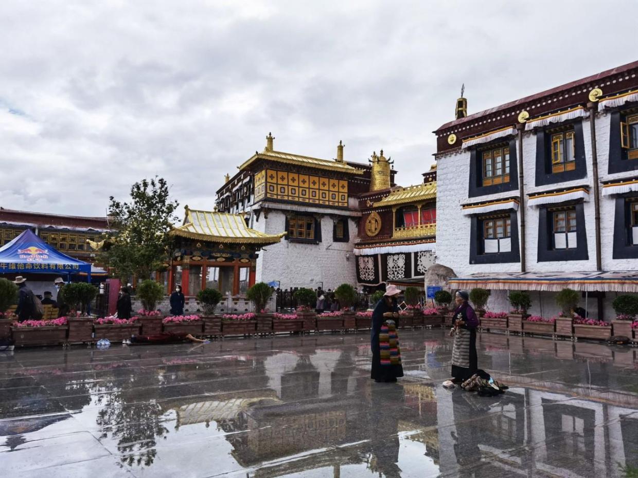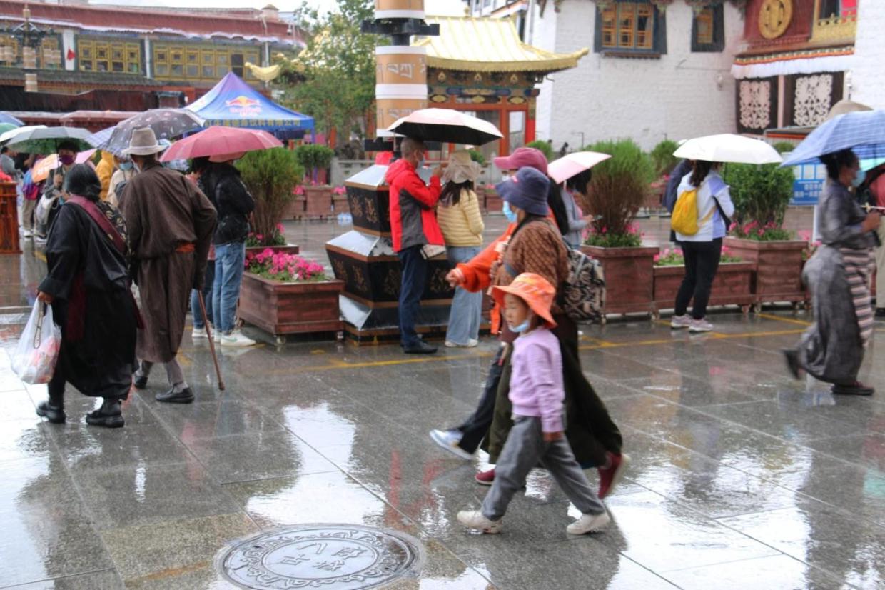 雨水中,虔诚信徒三步一头,顺时钟沿着大昭寺磕着五体投地的长头,身边的游客与民众都不在他们的眼中,走三步,跪下,全身匍匐在地,不知道此刻他们的内心世界是什么样的世界,也许尊重理解是此刻彼此的最大公约数。
