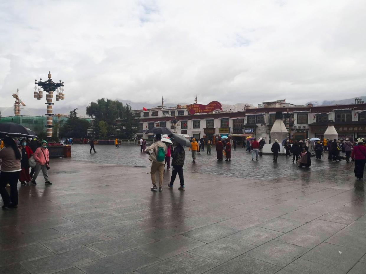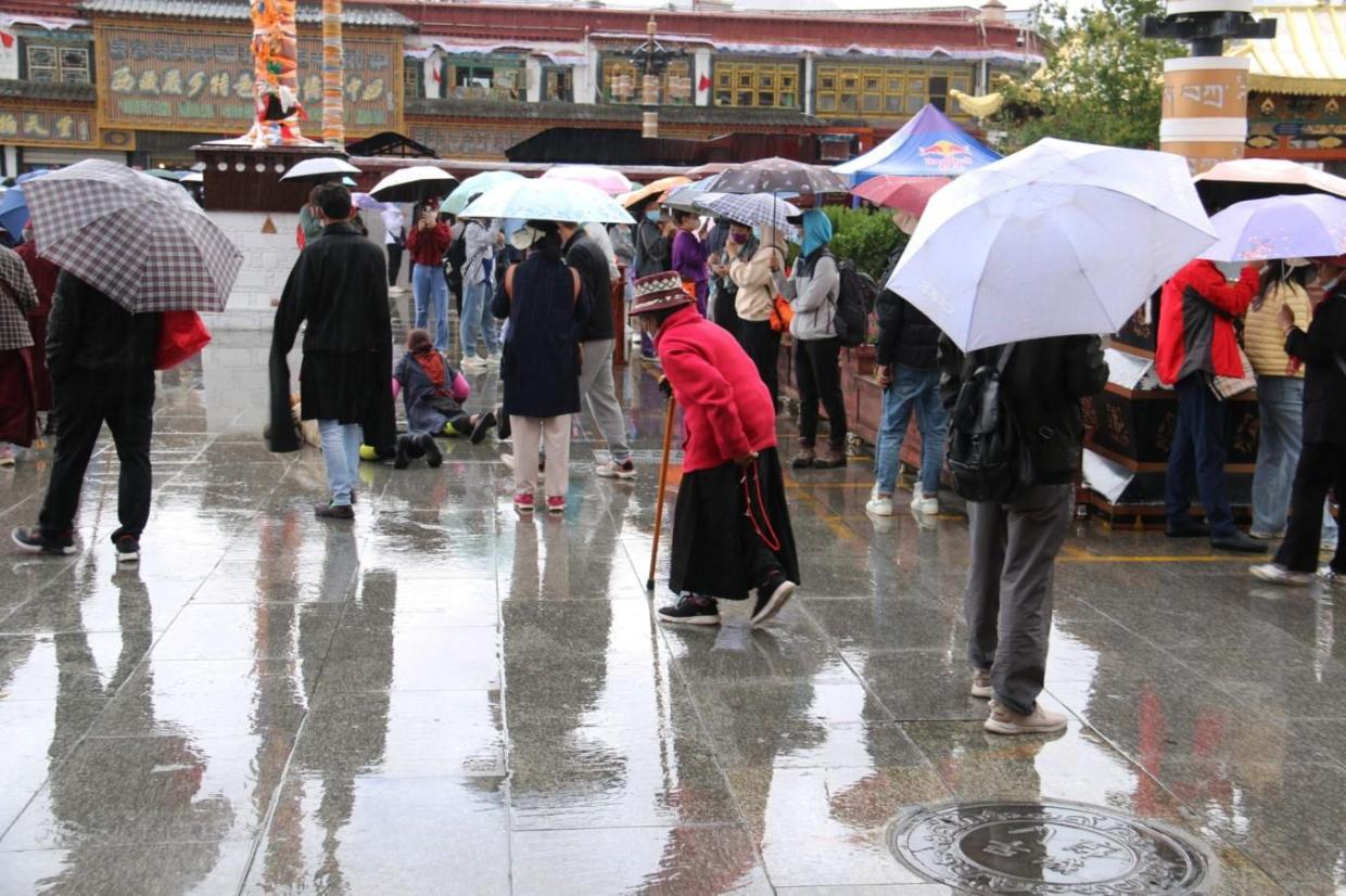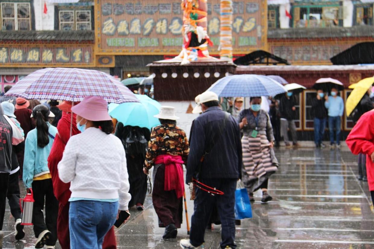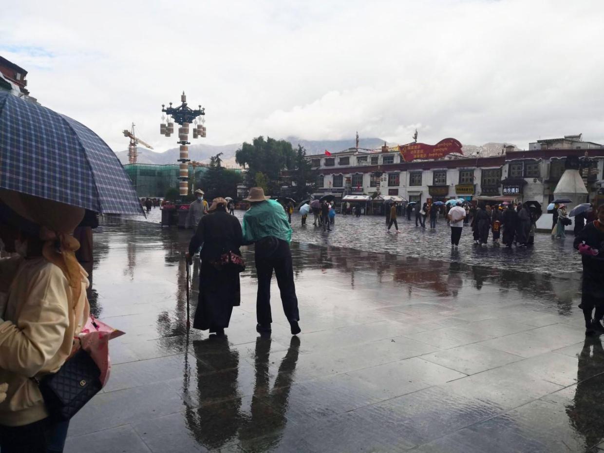 高原的气候说变就变,淅淅沥沥的下起小雨,广场上的人民开始打起雨伞,有些游客跑进周边的商店躲雨,我们也待在一个商店的屋檐下,期盼这阵细雨快点过去。