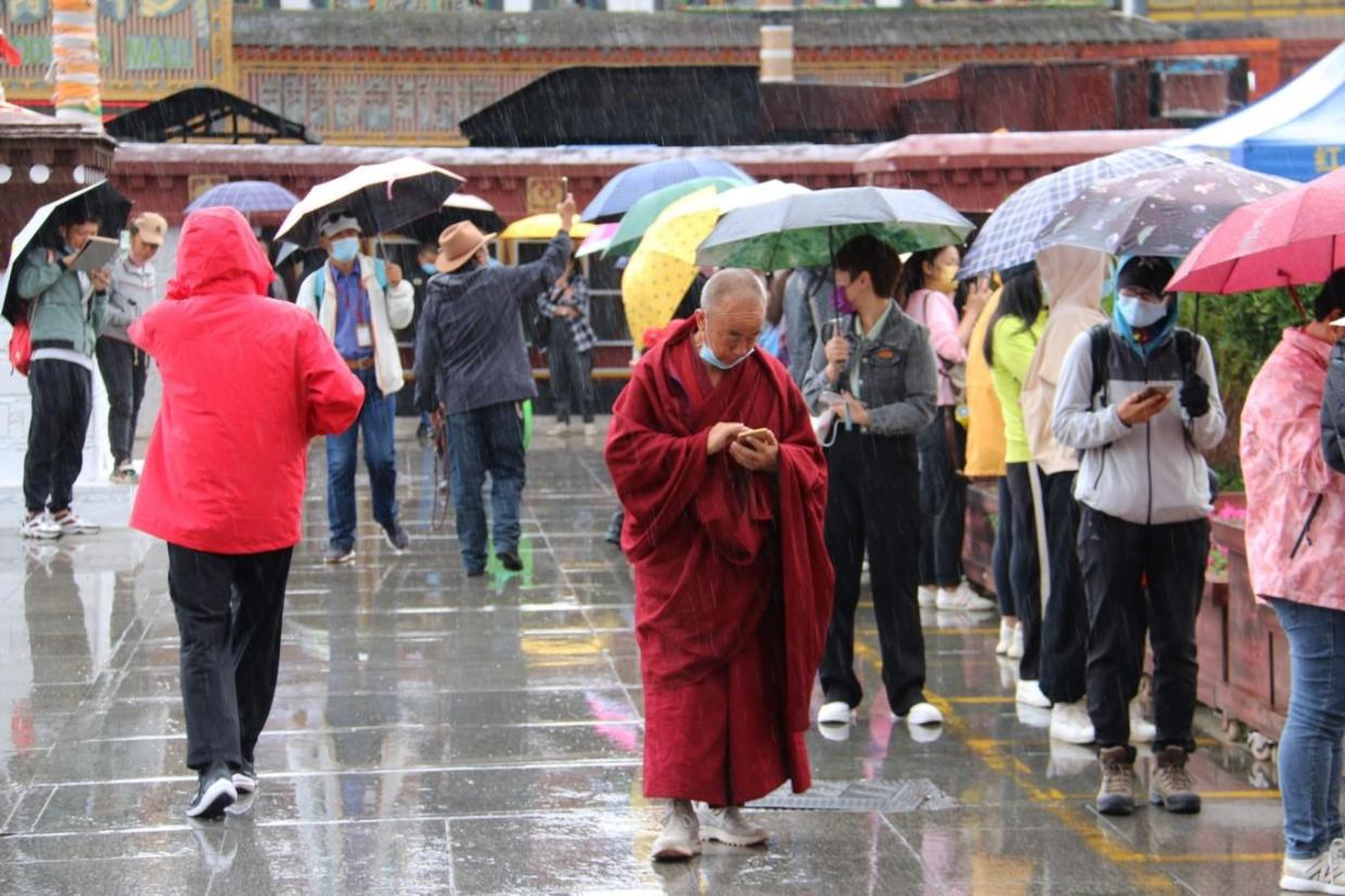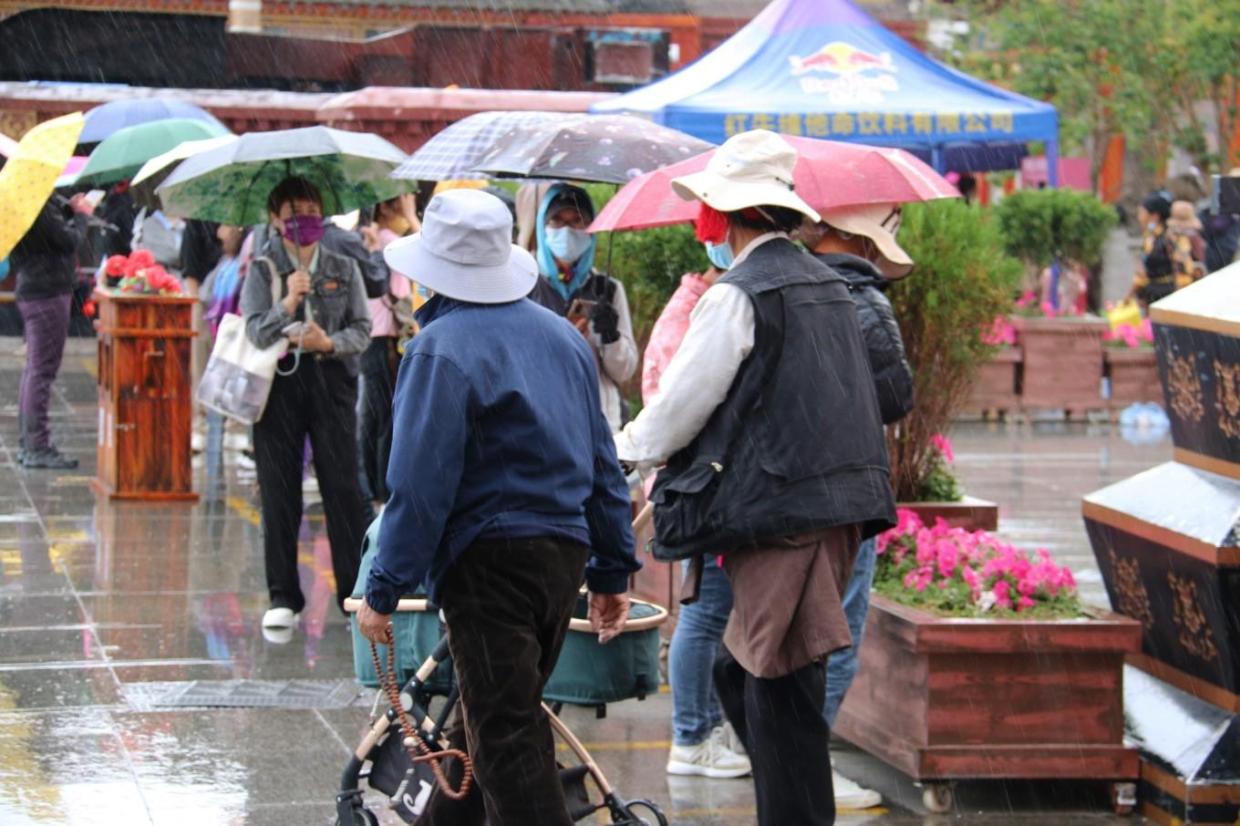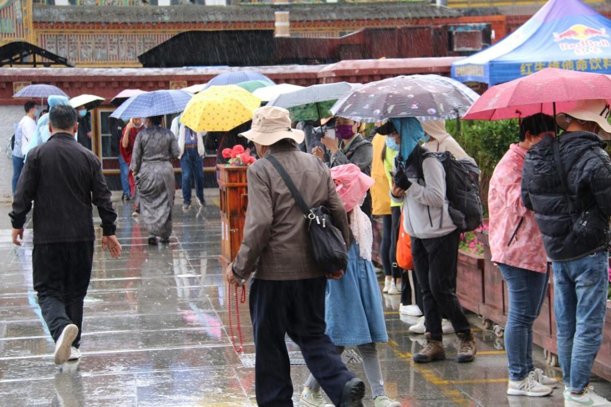 沿大昭寺一动一静两条人流,顺时钟流动的是转寺的当地民众和游客,拖家携口,老人们手里转着经筒,年轻妇女持着念珠,也有不少喇嘛和觉姆在默默的行走其间,游客们夹杂中间,好奇的雨中同行。逆时钟打着各色雨伞静静的排队的多是准备进入大昭寺的游客,耐心地等待大昭寺开门的时刻。