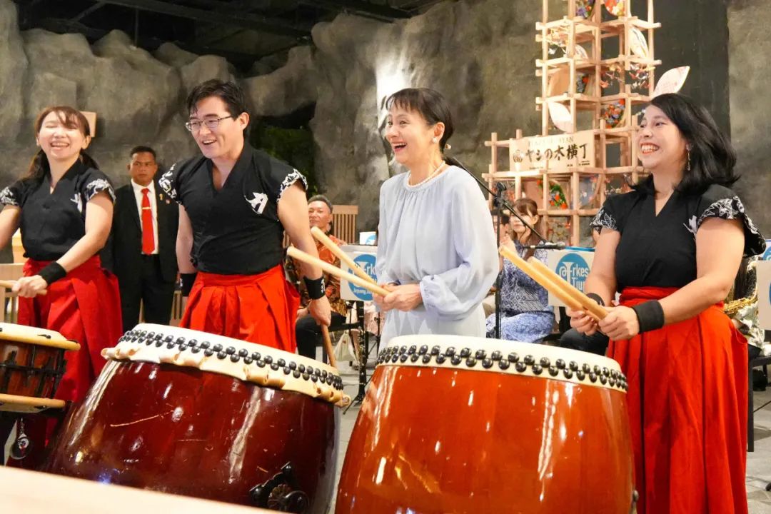 在日本和印尼两国演员合作的管弦乐表演中,佳子亲自挥舞鼓槌参与太鼓演奏。在太鼓激昂的节奏声中,佳子全情投入,将现场气氛带向高潮。