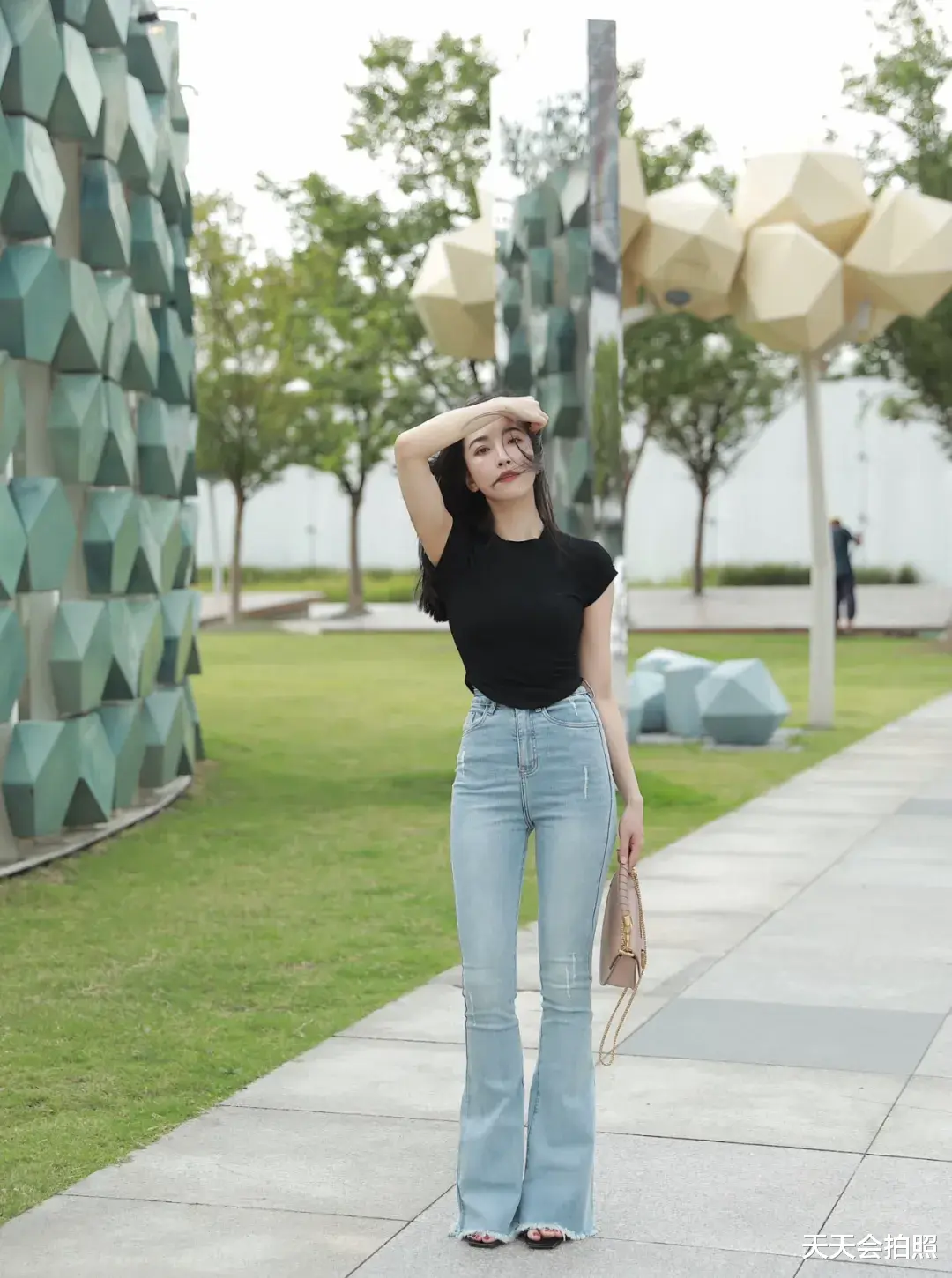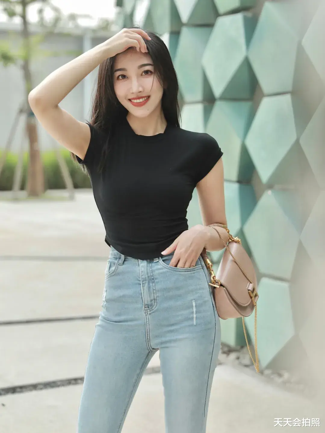高腰紧身牛仔裤本就非常显身材,在拍照时,我们可以展现一点自己的小心思,微微抬起一条腿,同时抬手去撩头发,低头露出微笑,既显得整个人很放松,有日常感,也会让镜头非常自然、温柔,拍出来就很有范儿!