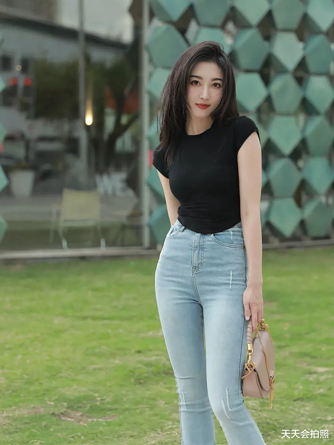侧身站立,微微抬头,展现出自信昂扬的姿态。一手扶胯,一手自然拎包,显得整个人落落大方。侧身状态下,能清晰地看到牛仔裤将腿部曲线勾勒得恰到好处,从腰部到腿部的线条流畅自然,拉长了腿部的视觉效果,轻松拍出高级又有格调的照片。