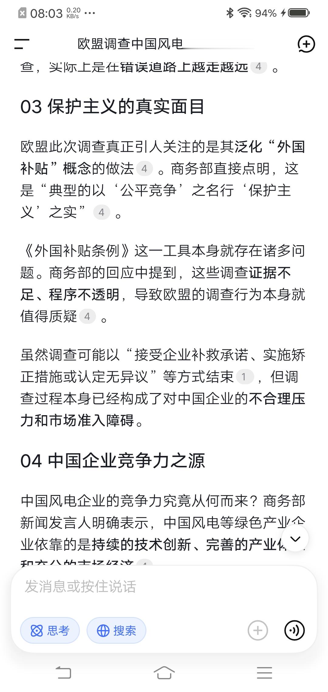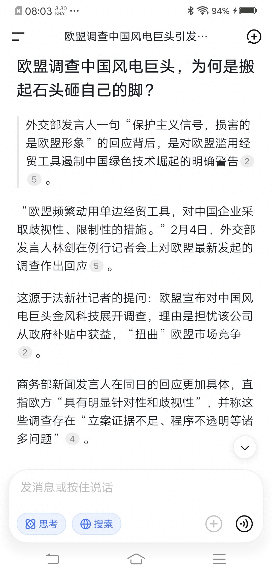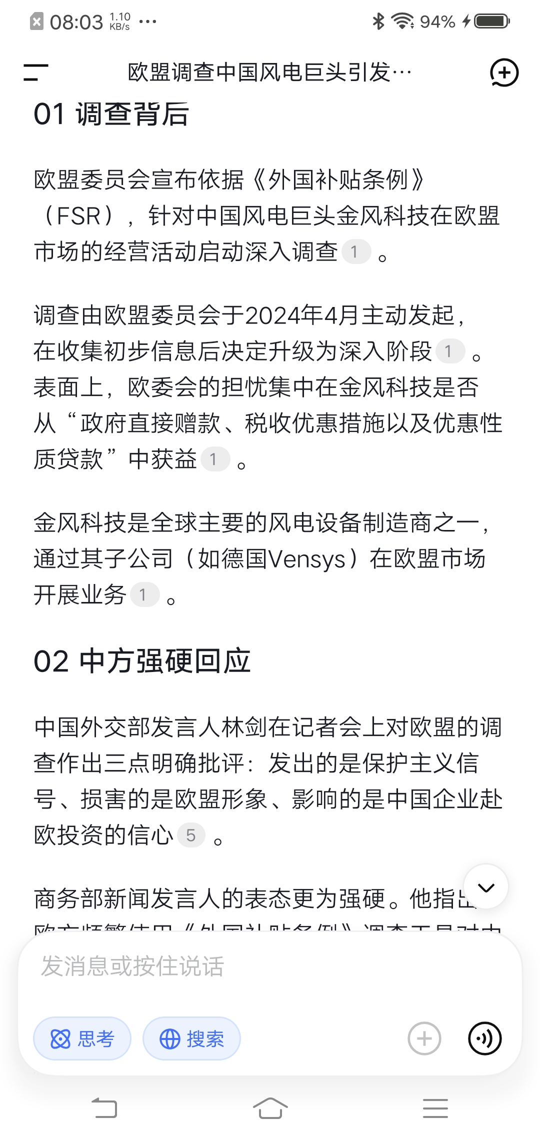 商务部新闻发言人的表态更为强硬。他指出,欧方频繁使用《外国补贴条例》调查工具对中国企业发起调查,具有明显针对性和歧视性,中方对此高度关切,强烈不满。