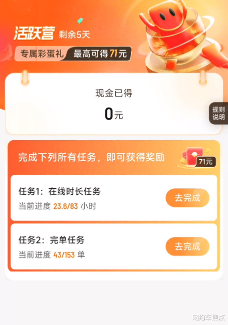 活跃营任务一般是以一个月为周期,分为四个阶段,一周一个阶段一个任务:有的司机要求在线总时长达到83小时,同时需完成153个订单,奖励71元。