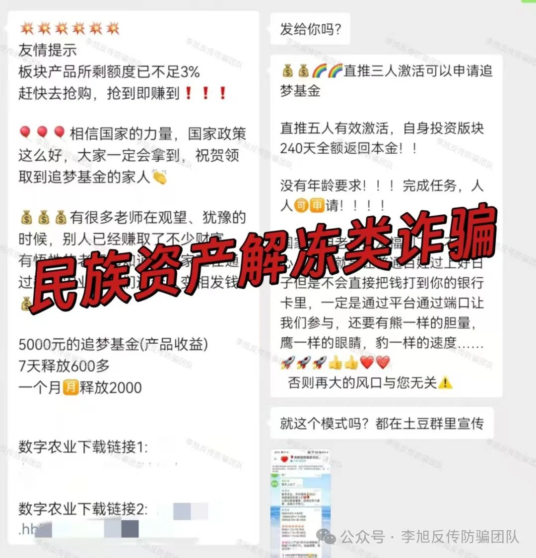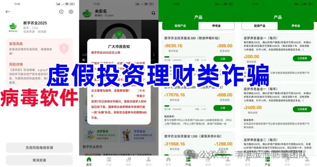 冒充国家部门名义,号称直推3人可申请追梦基金。同时打着“数字农业”“乡村振兴”旗号,虚构推广“数字农业投资基金388(粮食种植补贴)”“数字农业投资基金688(特殊农产品补贴)”“追梦养老基金”等高额返利理财项目。该项目下载提示未备案且携带病毒,收款账户为第三方个人、公司,涉嫌诈骗。