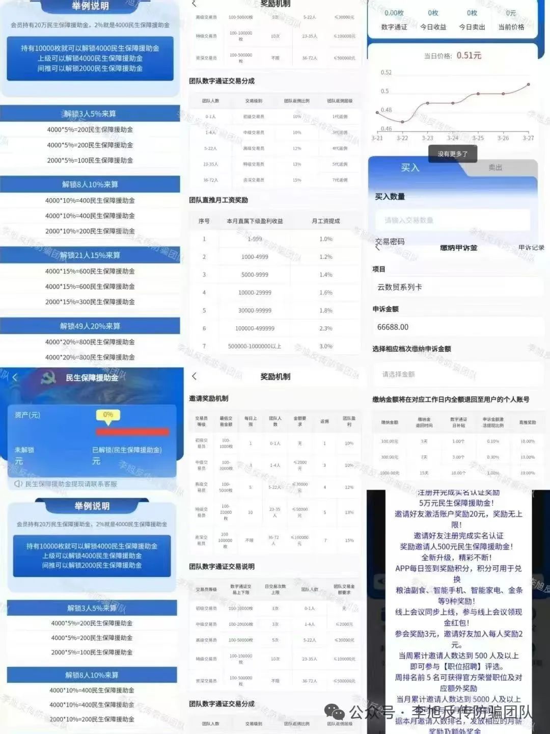同时,平台发行“数字通证”,用户可按照每日价格进行交易买卖,设立“初级—资深交易员”5个级别,根据交易数量和团队人数完成晋升,发放邀请奖励、团队返佣、直推月工资等多项奖励。持有更多“通证”并推荐相应人数解锁更多民生援助金。