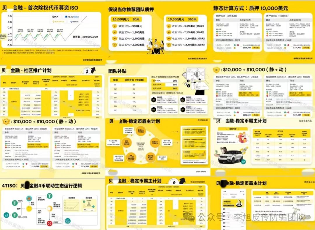 设置静态收益,根据质押天数(9天、90天、180天、360天等)给予0.3%-4%的量化收益,且有出局机制和全网分红;动态收益包含直推、团队收益、平级收益、超越收益等,团队推广按有效账户、联合小部门考核划分等级(D1到B7),不同等级有对应的团队补贴,补贴比例随级别升高而增加,与质押天数挂钩,同时存在推荐奖励、见点收益等多层级奖励机制,甚至宣称静态质押360天一年可获27倍收益等高额回报。