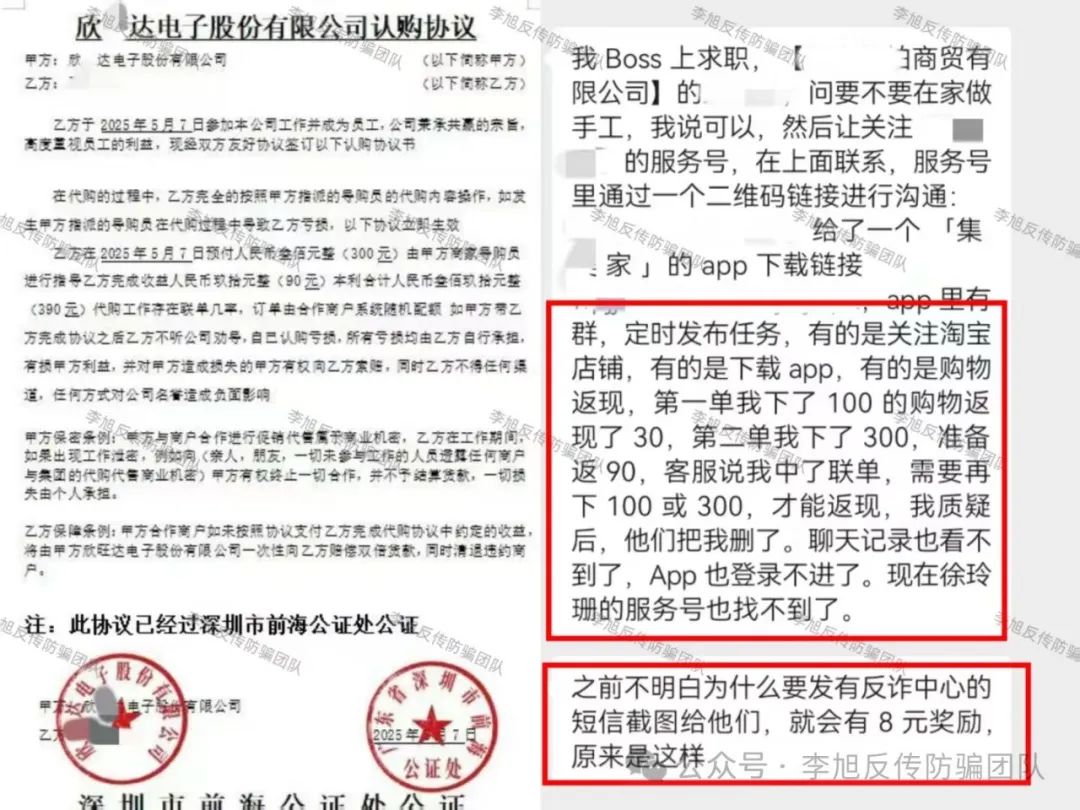 网友在某招聘软件上被邀请从事手工活工作。随后,对方发来二维码要求网友下载并按时完成关注、购物等任务获得佣金,甚至要求网友将下载时接到的反诈中心短信截图发送给客服领取8元红包。没想到第二单时,客服便宣称获得联单,要求网友继续追加投资以获得返现。而这时网友警觉提出质疑,随后便被拉黑删除。