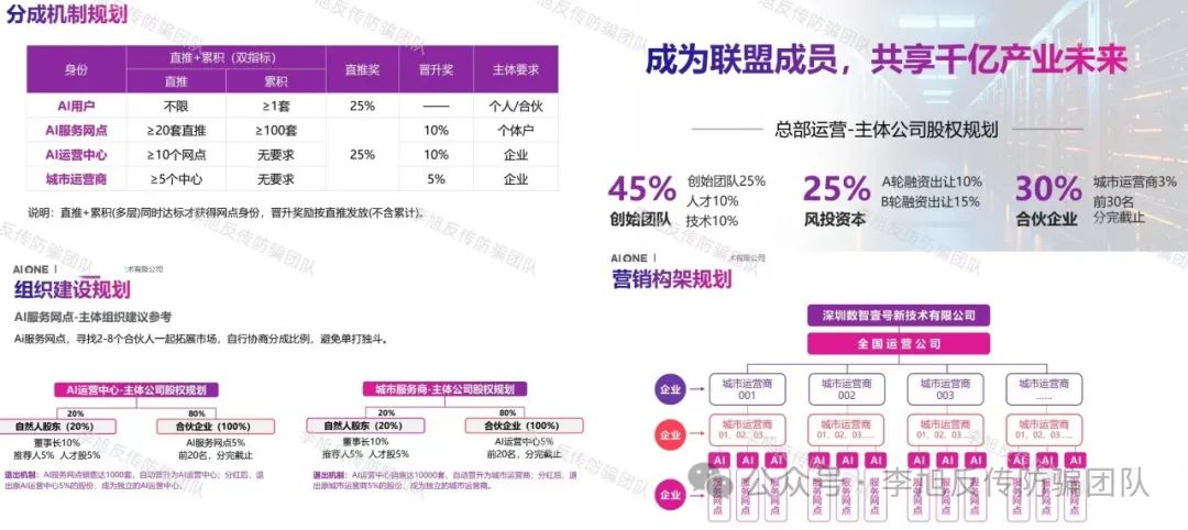 将参与者分为AI用户、AI服务网点、AI运营中心、城市运营商四级,层级晋升与奖励机制紧密挂钩。其中,AI用户无明确直推和累积要求,购买1套及以上产品即可获得25%直推奖;AI服务网点需完成直推20套以上、累积100套以上任务,可获25%直推奖和10%晋升奖;AI运营中心要求直推10个以上网点,获得10%直推奖;城市运营商需直推5个以上中心,获5%直推奖。该模式还涉及组织建设,AI服务网点可找2 - 8个合伙人,AI运营中心和城市运营商有特定股权规划及退出机制,如销售达标可晋升并退出原股份。