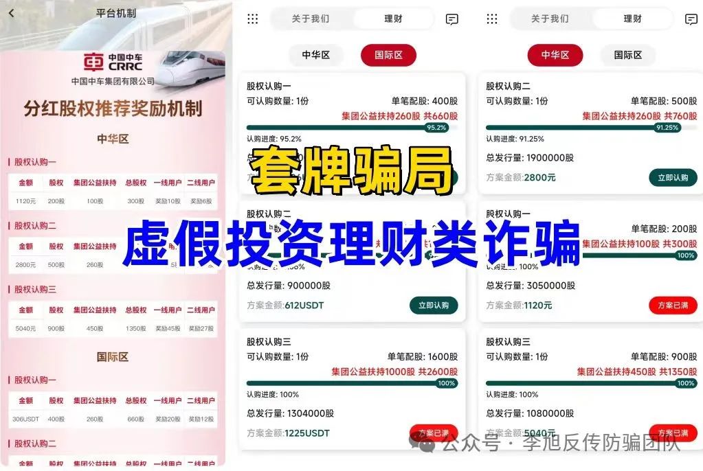冒充“中国中车”集团名义,虚构推广“中华区股权”“国际区股权”等高额返利理财项目。