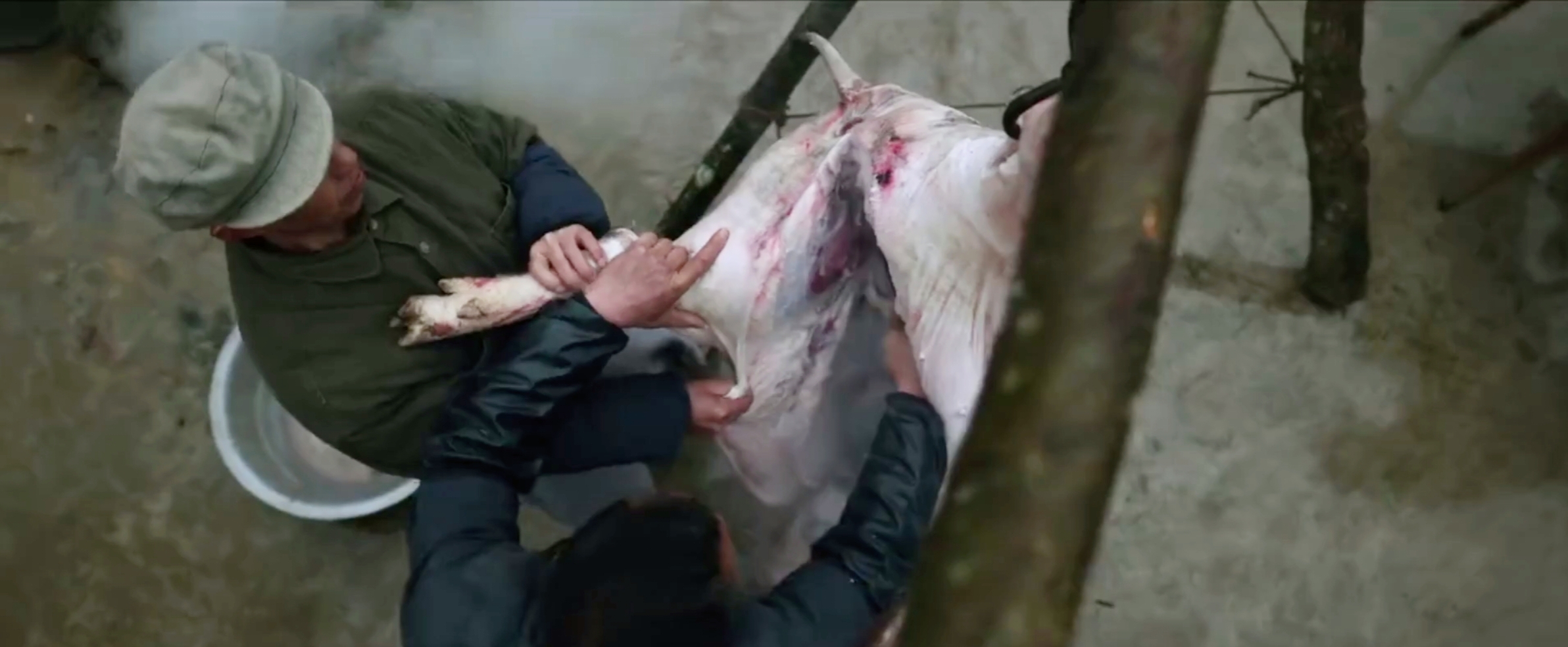 后者则比较粗粝和写实,没有任何美化和修饰,直接把山区农村杀年猪的场景呈现了出来。