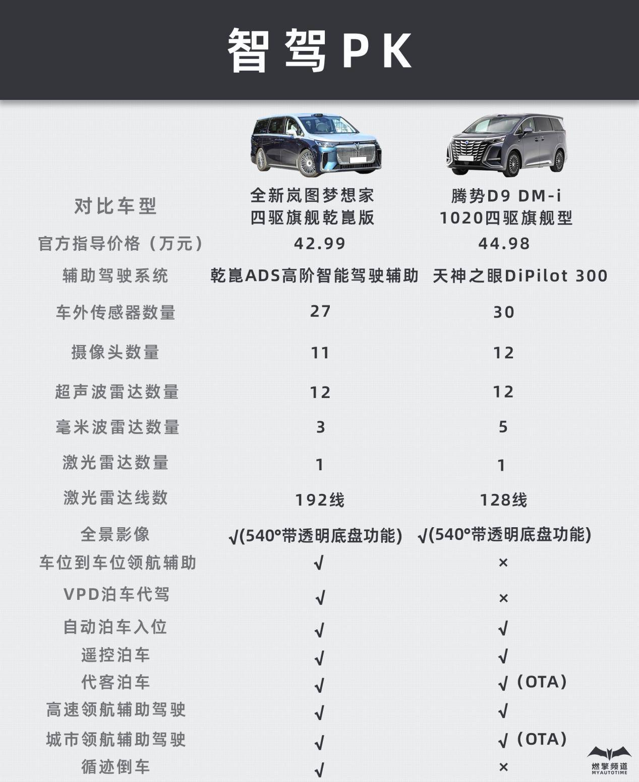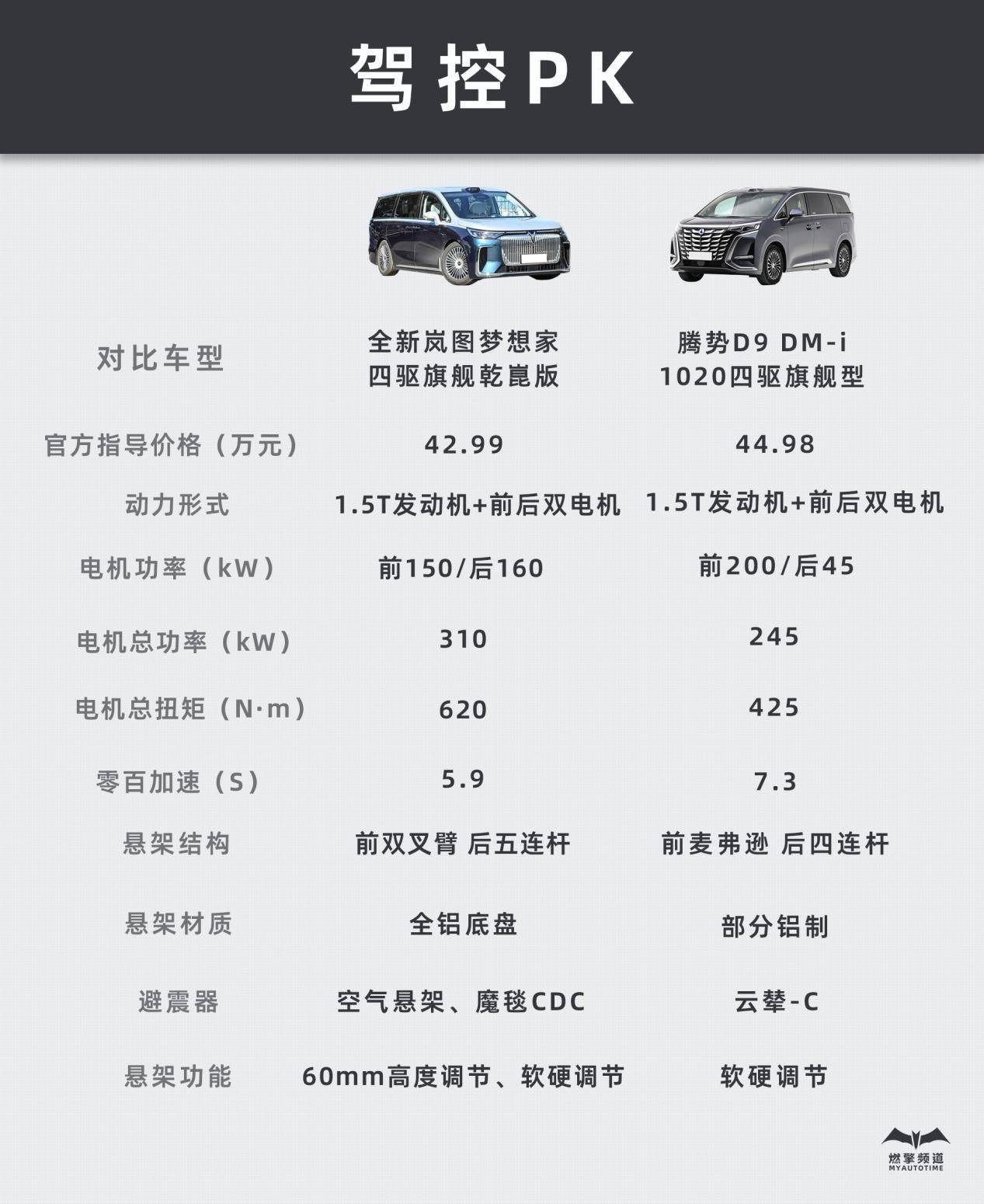 为了更直观做比较,我们选择售价42.99万元的全新岚图梦想家四驱旗舰乾崑版和售价44.98万元的2025款腾势D9 DM-i 1020四驱旗舰型,进行一场针尖对麦芒的比拼。