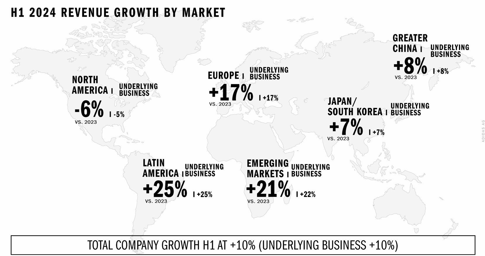 欧洲杯和美洲杯相关的球衣销售,让二季度服装业务增长了6%。赢得比赛的西班牙和阿根廷球队都穿着阿迪达斯球衣。7月的欧洲杯上,少年天才球星亚马尔大放光彩,5个月前,阿迪达斯刚刚签下了他。