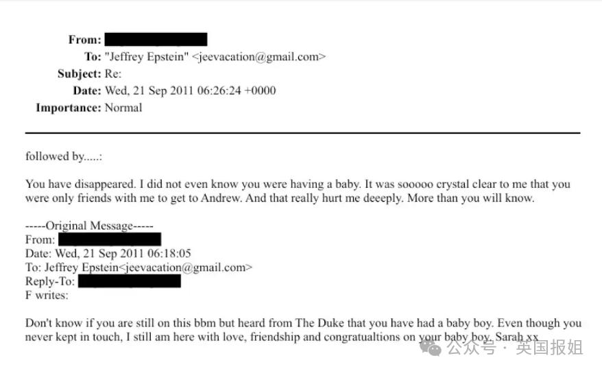 在2011年9月的一封邮件里,莎拉提到从前夫安德鲁那里听说爱泼斯坦喜得贵子,于是向他表示祝贺。