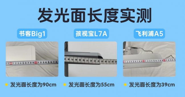 使用卷尺精准测量三款台灯的发光面实际长度,记录具体数据,并观察光线在书桌上的实际覆盖范围。