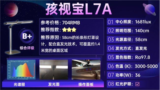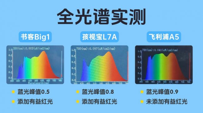 孩视宝L7A表现中规中矩,虽有亮点但短板明显:其蓝光峰值为0.8,处于安全可接受范围上限,虽然添加了红光增益,在一定程度上弥补了蓝光控制的不足,缓解视疲劳的效果优于飞利浦A5,但红光增益的技术成熟度远不及书客Big1,且蓝光峰值偏高,长期高强度使用仍会给眼睛带来额外负担。