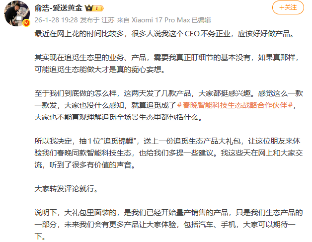值得注意的是,近期俞浩在社交平台与网友互动活跃度上升,有网友评论“是否在打造像雷军、刘强东那样的个人IP”,他表示,“我们要从垂直赛道的专业品牌,到国民品牌。企业在垂直品牌阶段,主要重心应放在做好产品与技术上,讲好产品创新和功能。而到国民品牌的时候,受重是很宽泛的。有的需要更广谱的了解,有的需要更深度的解读。”