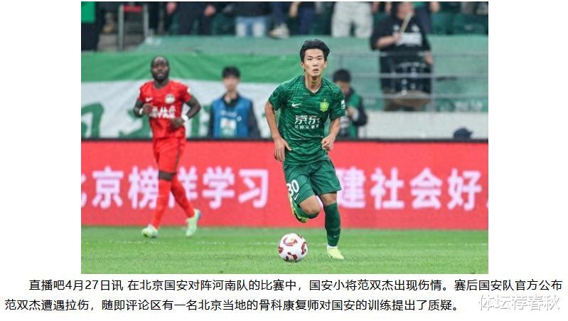 一轮联赛,北京国安队在主场1-0小胜河南队,迎来了本赛季的首个2连胜。然而,本场比赛国安队再次出现了伤病和红牌的情况。多名主力球员停赛,让国安队的阵容捉襟见肘。而小将范双杰在比赛中腿部拉伤,再次将国安队的伤病问题推到了风口浪尖之上。
