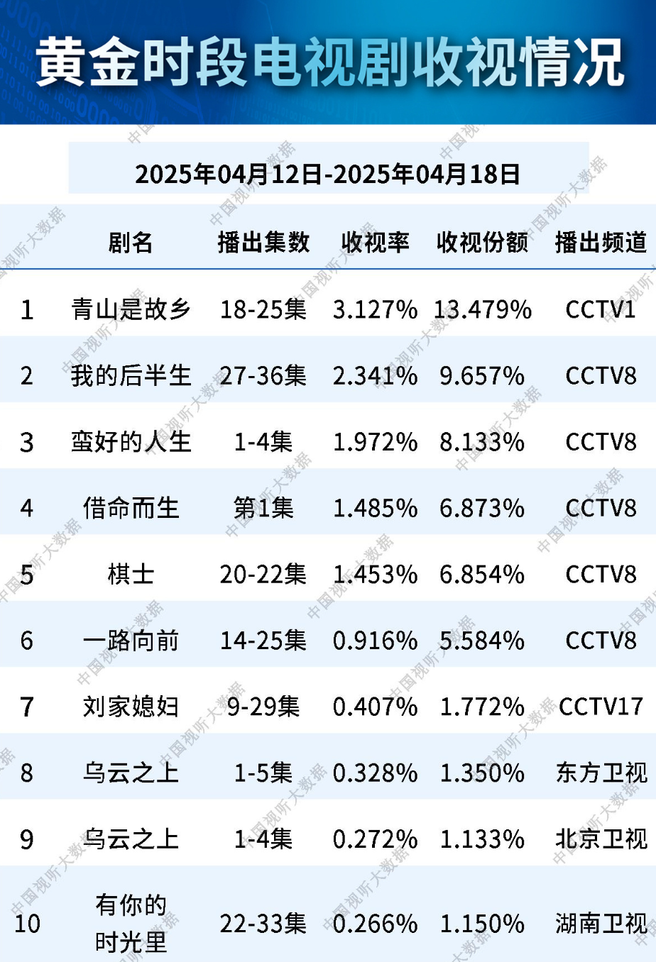 眼下总局公布了4月12日到4月18日黄金时段电视剧的收视情况,看看究竟哪一部热播剧能够脱颖而出吧。