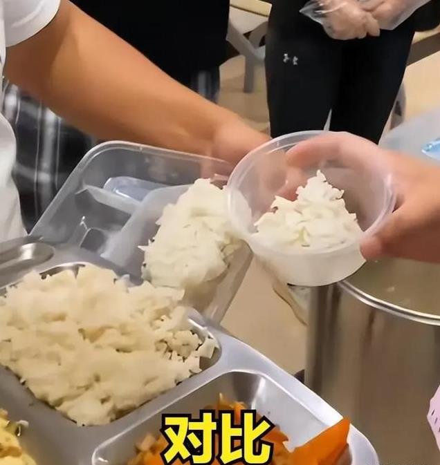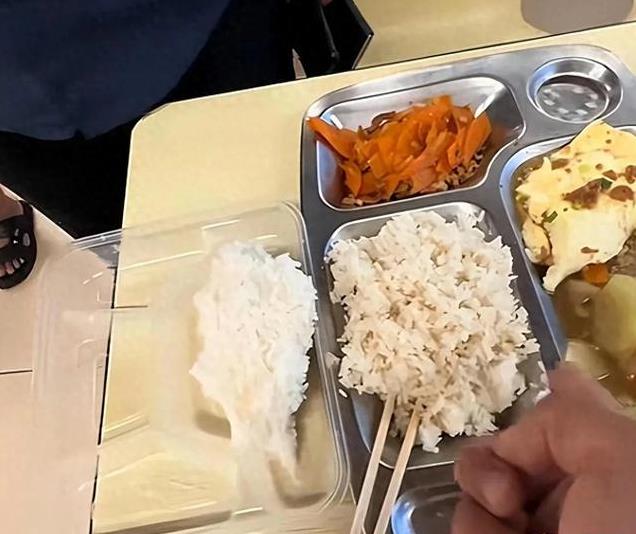 于是大哥找到了食堂负责人,在食堂内表示不满,并与工作人员手中的米饭进行对比。他坚称自己碗里的米饭发黄,颜色与工作人员手中的米饭不同。