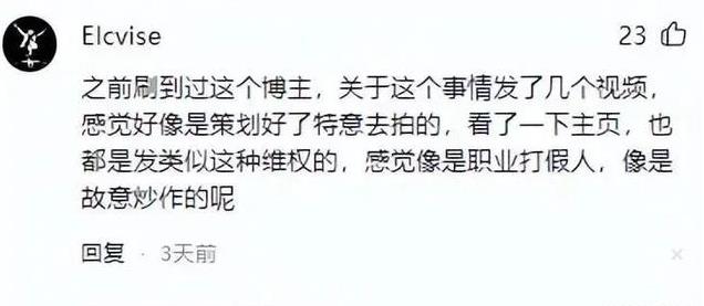 有网友反映,他们之前在社交媒体上看到过这位博主的相关内容,感觉就像是有意安排的剧本,很多视频都是围绕维权主题,类似职业打假人的行为,似乎是为了吸引流量而故意炒作。