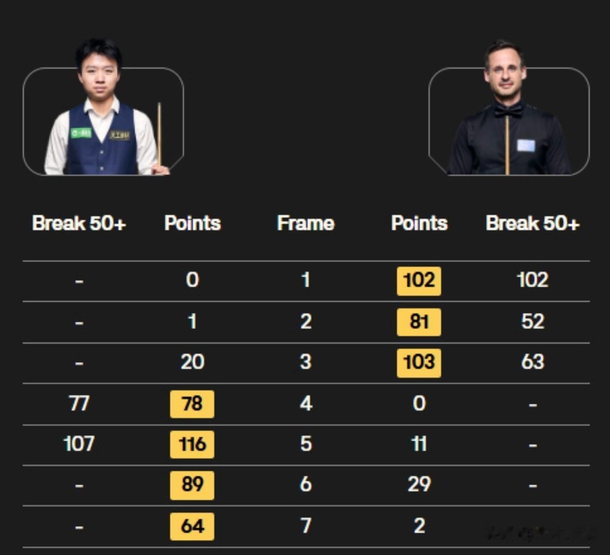 另外一场德比之战中,小将常冰玉面对斯佳辉,状态爆棚,轰出105、110分两杆破百,以4-1大胜晋级,倒是斯佳辉状态低迷,全程被压制,全场三局仅得74分,两局被零封。