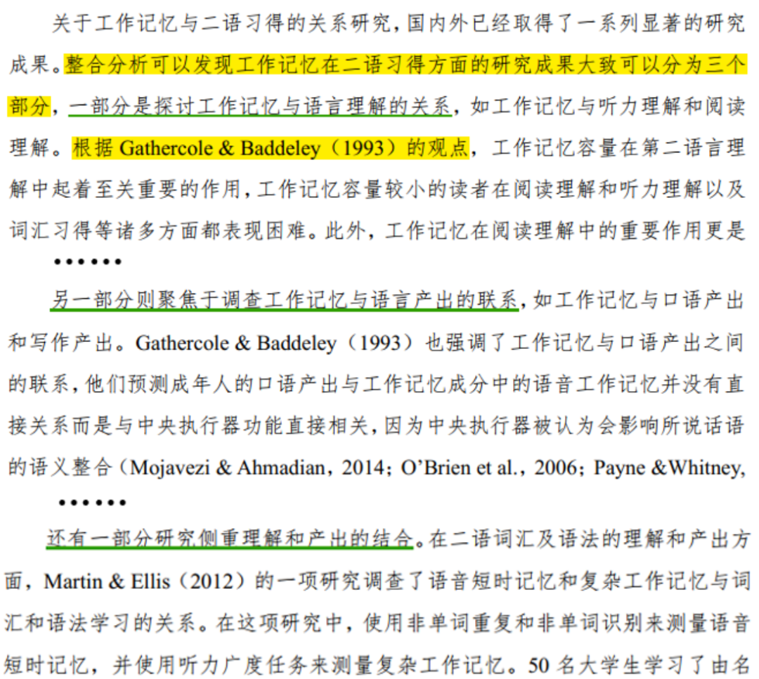 在图中,作者针对工作记忆在二语习得方面的研究成果进行了总结,并且使用自己的语言对这些成果进行了分类和分析。此外,作者还列出了研究者的信息,并加入引文来证明和支撑自己的观点。