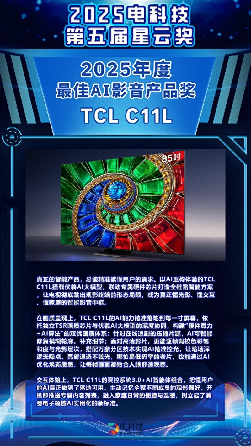 在电科技网主办的第五届(2025)星云奖评选中,TCL C11L凭借硬核的产品实力斩获“年度最佳AI影音产品奖”。作为以“AI驱动万物,智慧重塑未来”为主题的行业权威奖项,星云奖的评选历经报名、初审、复审多轮严苛筛选,汇聚了专家评审的专业洞察、编辑团队的客观甄别与海量用户的真实反馈,其结果极具公信力。TCL C11L的获奖绝非偶然,而是其在AI技术融合、影音画质表现与用户体验创新等维度的综合实力,与奖项核心评选标准高度契合的必然结果。