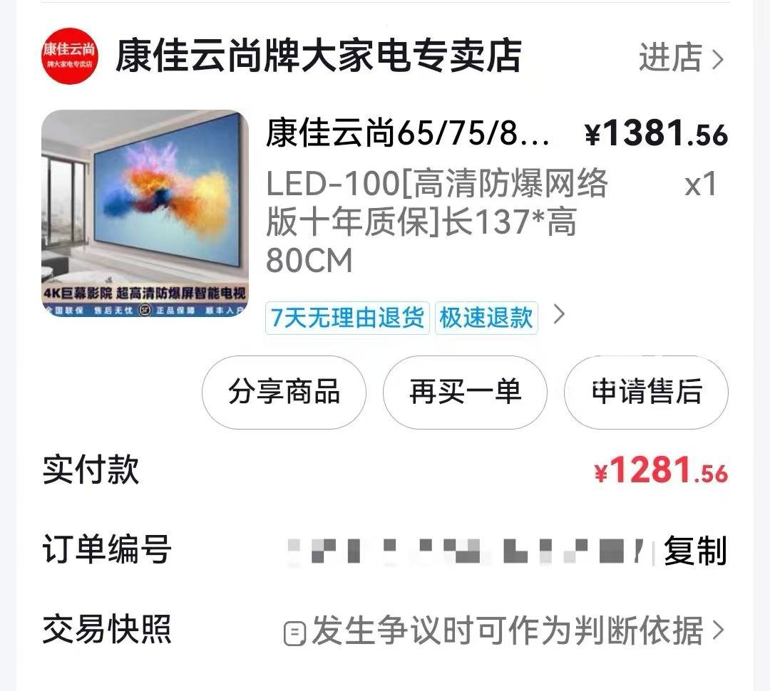 信网/信号新闻12月14日讯近日,黑龙江的张先生向信号新闻(0532-80889431)反映,9月6日他在短视频平台“康佳云尚健康电器”店铺花费1281.56元购买了一台康佳云尚电视。使用约两个月后,电视屏幕上半部分突然黑屏。联系店铺客服换得新机后,不到一个月,新电视又出现整个屏幕发白的现象,张先生因此向商家提出全额退货退款的诉求,但遭拒绝。