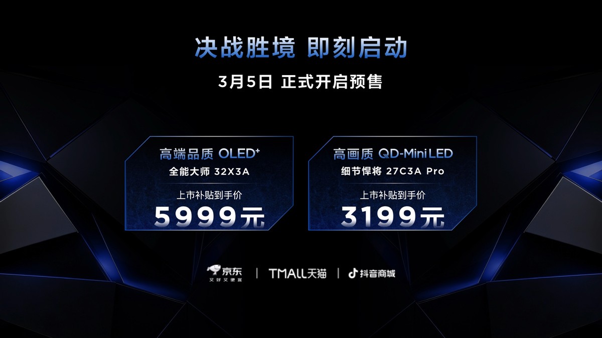 通往“胜境”的大门已经开启。“全能至臻”32X3A上市首发价5999元,“细节悍将”27C3A Pro上市首发价3199元,即日起在TCL官方商城及各大合作平台开启预售。本次发布不止于三款旗舰产品,而是一个完整的系列产品。除了作为标杆的X3A、C3A Pro和P2A Ultra,每个系列旗下都提供不同尺寸、不同规格配置的版本,无论需求选择如何、桌面空间多大、功能侧重有何不同,都能在TCL显示器中找到最适合的那一款。