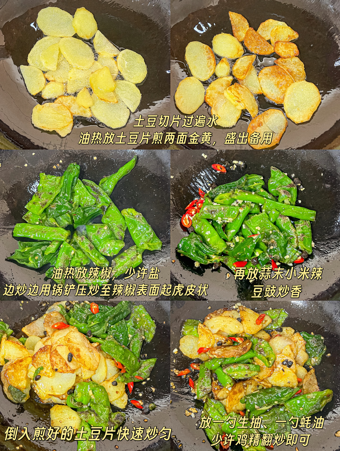 锅中再添少许油,放入青椒,撒一点点盐——盐能帮助辣椒更快煸软。用锅铲边炒边轻轻按压,让辣椒每一寸表皮都紧贴锅底,直到表面出现焦黄的虎皮纹路,辣香被热力彻底激发出来。这时加入蒜末与小米辣碎,炝出辛辣的香气,再放入豆豉翻炒几下,酱香和辣香瞬间交融。调一勺生抽、一勺蚝油,让酱汁裹满辣椒,接着倒入之前煎好的土豆片,转大火快速翻炒,让每一片土豆都沾上浓郁的料汁。出锅前撒少许鸡精提鲜,翻炒均匀即可装盘。