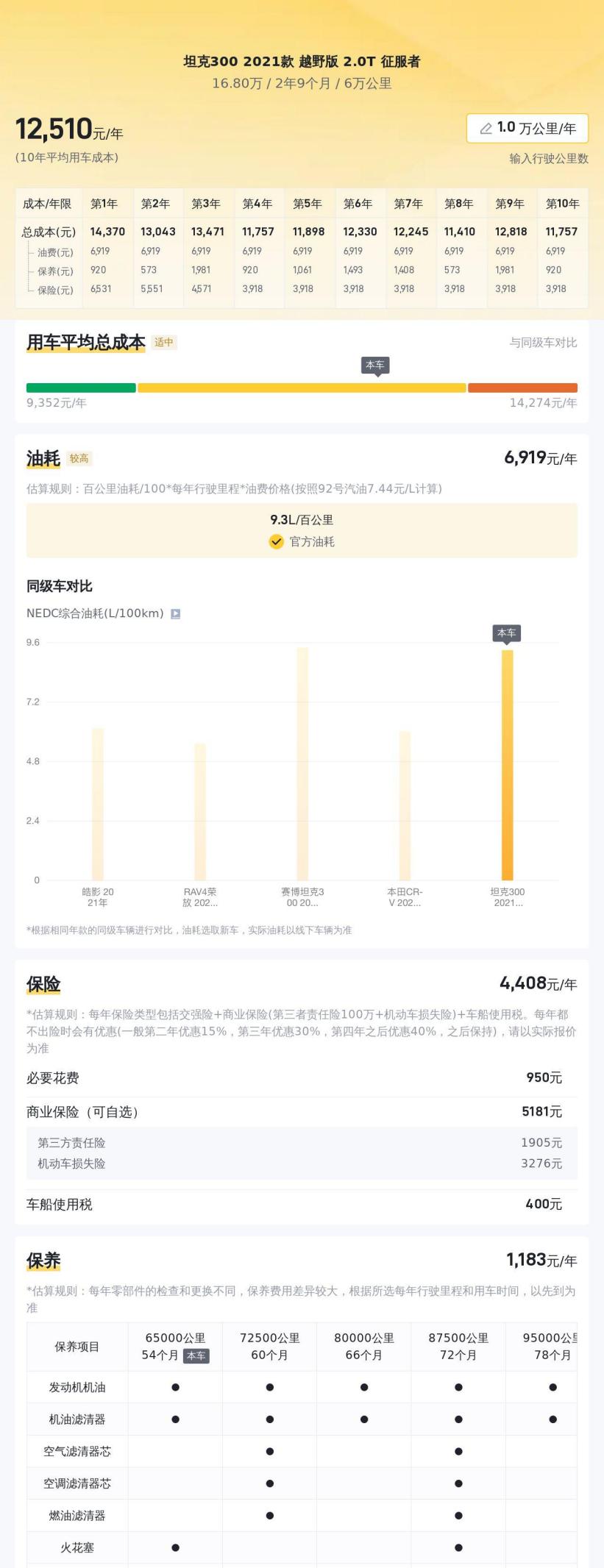 除了车价,你还需要考虑后期的用车成本。根据懂车帝的数据,坦克300的平均每年保养费用大约1800元,保险费用大约4300元。再加上油费,每年的用车成本大概在2万元左右。当然,这只是一个参考值,具体的费用还要根据你的实际用车情况来计算。