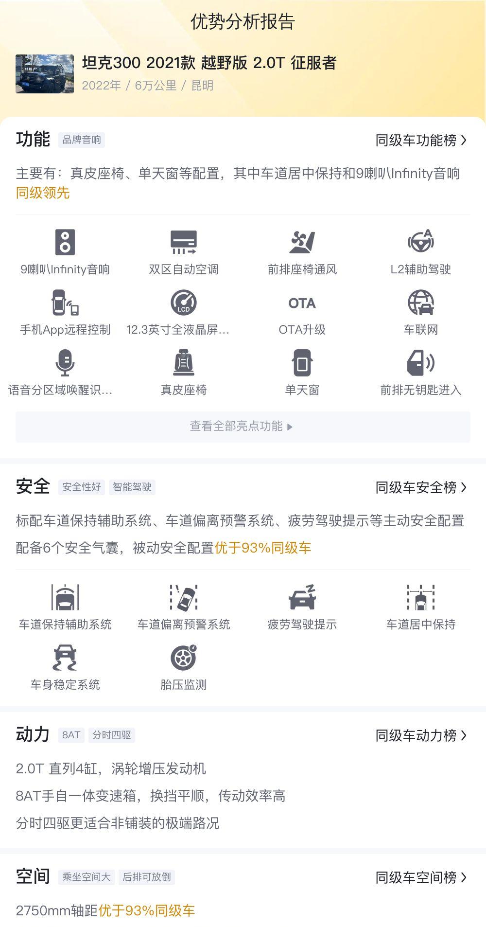 接下来,咱们聊聊这辆坦克300的配置。2021款越野版2.0T征服者,当年可是坦克300的热门车型。真皮座椅、单天窗、车道保持、座椅通风,这些配置在如今看来依然实用。尤其是车道保持和座椅通风,对于长途驾驶来说,简直是提升舒适性和安全性的利器。想想在炎炎夏日,开着空调,吹着座椅通风,跑在长途公路上,那感觉,别提多惬意了!