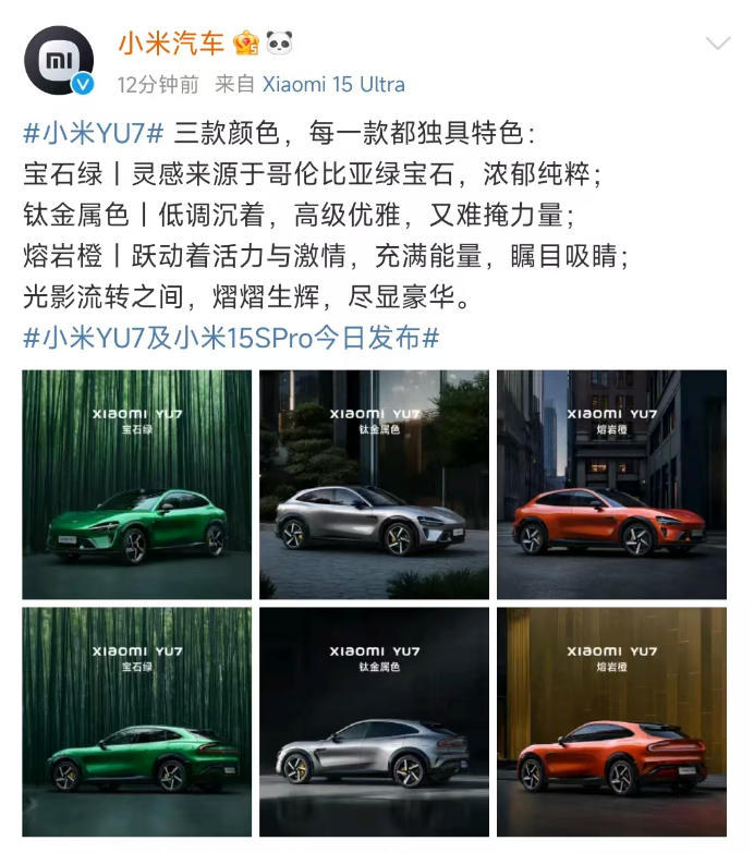 5月22日,小米集团董事长雷军在小米15周年战略新品发布会上宣布,小米YU7正式发布,定位 “豪华高性能SUV”。 小米YU7在空间、续航和性能等关键参数上,全面对标Model Y,实现领先。车身尺寸方面,YU7车长5米,轴距3米,车宽2米,属于中大型SUV级别。小米汽车公布了三款配色产品图,分别是宝石绿、钛金属色、熔岩橙。