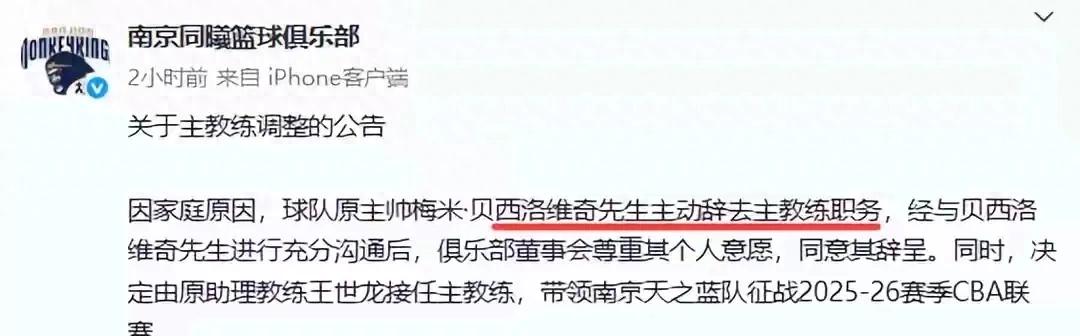 CBA第一位主教练下课,南京同曦篮球俱乐部官宣:主教练贝西洛维奇因家庭原因主动辞职,俱乐部决定由助理教练王世龙接任主教练,带领球队继续征战2025-26赛季。